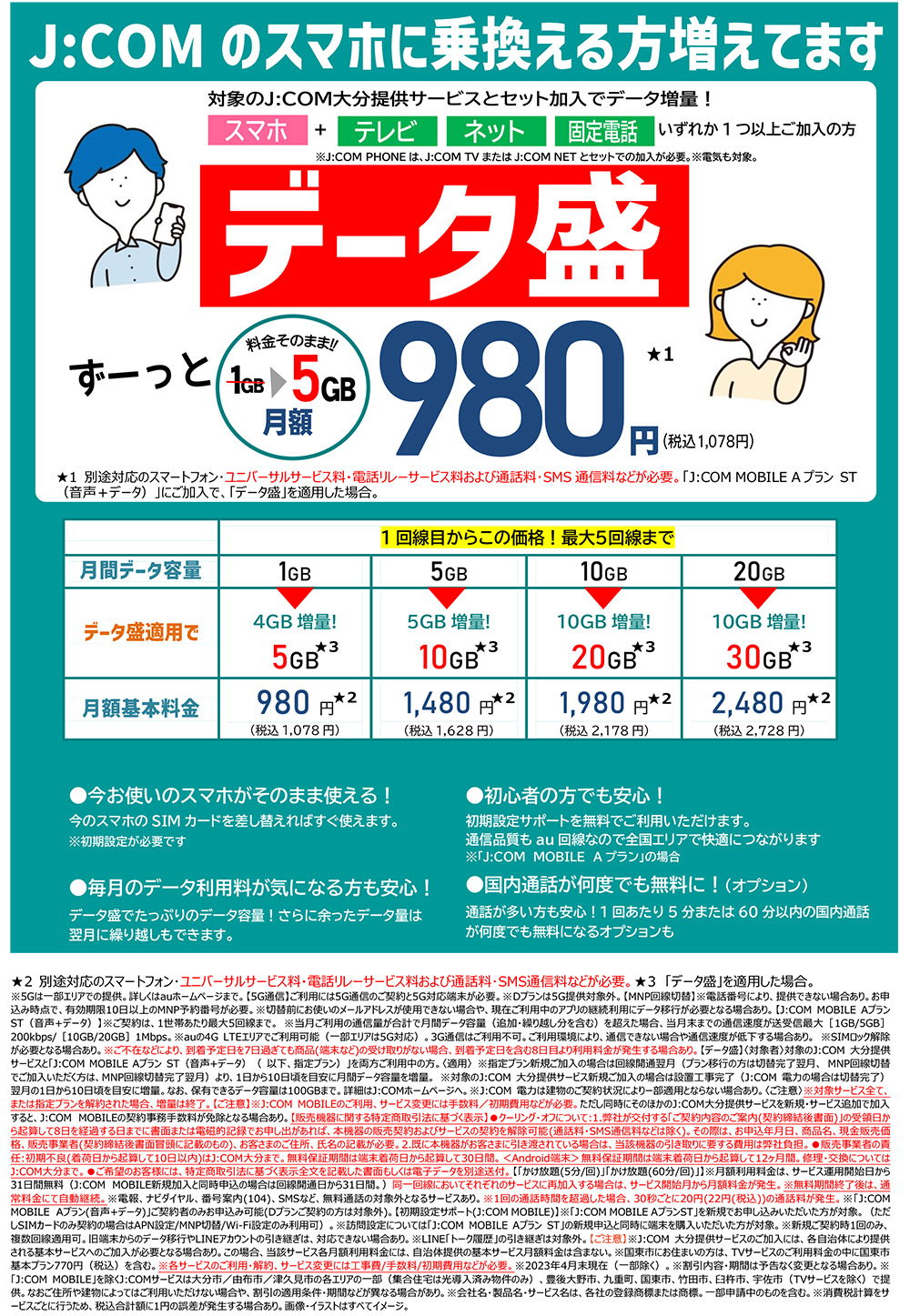 | J:COM MOBILE Aプラン ST(音声+データ) | 3,000円(税込3,300円) |